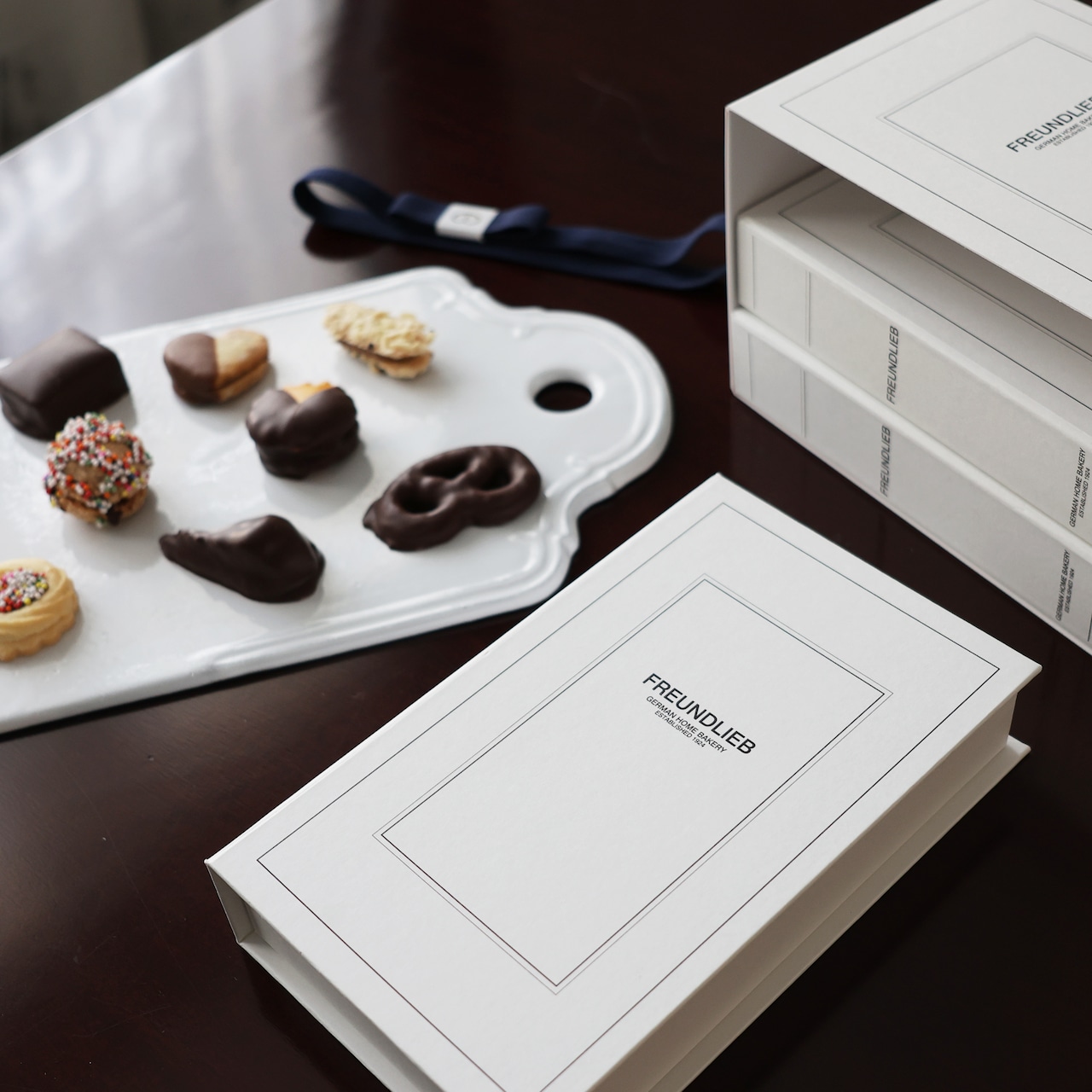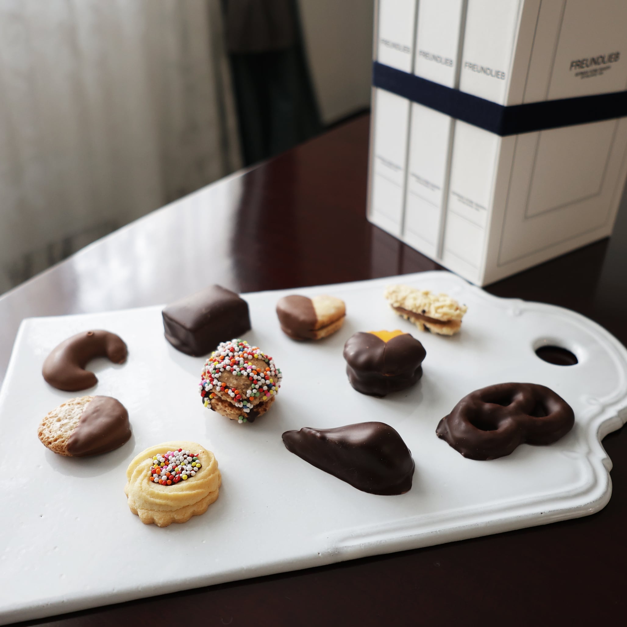 バターやナッツを練り込んで焼き上げたクッキーに、トリフルやヌガーをサンドし、チョコーレートでひとつずつ丁寧にコーティング。